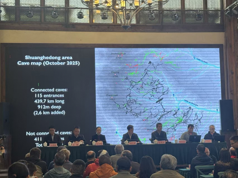 Voici les premiers résultats de l'expédition spéléologique Dongxuè zhishi qui s'est déroulée au mois d'octobre 2025. Ils ont été présentés lors du meeting de clôture. La grotte de Shuanghedong 双河洞 (Chine 中国, Guizhou 贵州省, Zunyi Shi 遵义市, Suiyang 绥阳) développe donc à ce jour 439 700 m de galeries pour un dénivelé total inchangé de 912 m et toujours avec 115 entrées connues. L'expédition a donc rajouté 2.6 km sur le réseau.