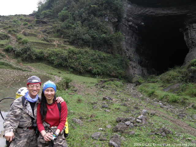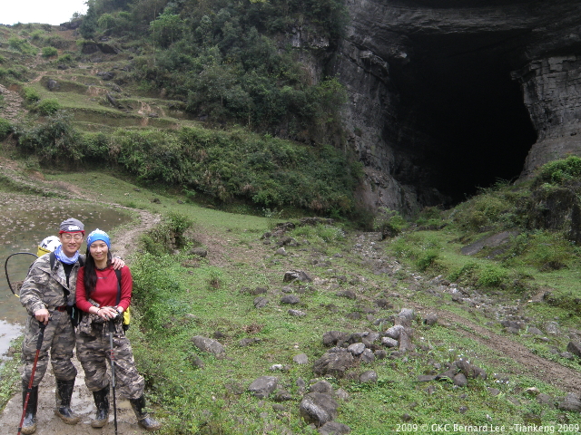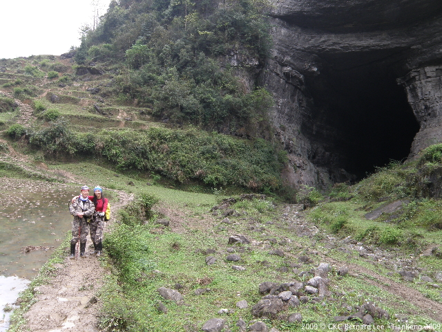 La perte de Xiadong se situe à l’extrémité d’une grande vallée aveugle très encaissée, parcourue par un écoulement temporaire pouvant débiter plusieurs m3/s lors des grandes pluies de mousson. Le porche mesure 60 m de haut sur 40 m de large. A 250 m de l’entrée, on bute sur une cascade de 10 m (à sec lors de l’exploration). Afin d’éviter les bassins profonds qui se situent à la base, on parcourt sur 70 m les vires localisées en rive gauche, puis on descend de 10 m dans le fond du méandre. La progression dans ce canyon souterrain est agréable. Certains bassins, qui ne peuvent être évités, contraignent l’explorateur à se mouiller à mi-cuisses. Les bassins profonds ont été équipés de mains-courantes. Quelques ressauts nécessitent également un équipement. Après 300 m de parcours dans le canyon, la galerie prend du volume et le courant d’air devient très puissant et rafraîchissant. La vitesse de progression augmente considérablement. Un ressaut est descendu après une vire en rive gauche. Au bout de 30 m, un puits de 15 m donne sur un lac dénommé la Piscine du Milliardaire que l’on contourne en rive droite. 250 m plus loin, on débouche dans la vallée par le porche de Yinhedong (voir infra). [L. Mangel]
