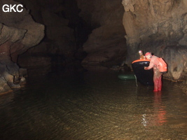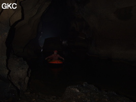 C’est par ce passage que, en enchaînant deux P7, un P17, un R3 et un P12, nous avons pu atteindre un étage inférieur dont les seuls prolongements notables rejoignent rapidement la perte de Longqiaogedong. La galerie supérieure se poursuit 150m à l’est, puis repart plein nord sur 250m. De nombreuses traces d’exploitation des nitrates y sont visibles. En passant sous une large arrivée en hauteur, la galerie change de morphologie et devient plus étroite et plus haute. Une corde est nécessaire pour descendre le deuxième ressaut de 5 m. Il donne accès à un étage inférieur, où un actif de 2 l/s s’enfile dans une fracture sous la galerie principale. Cette fracture étroite et fortement ventilée se poursuit sur une trentaine de mètres. Arrêt sur rien à la cote –52 m. L’exploration de l’actif amont est rapidement stoppée par un puits remontant de 16 m. À sa base, l’actif sort d’un petit siphon à la cote –44 m. [Nicolas Faure]